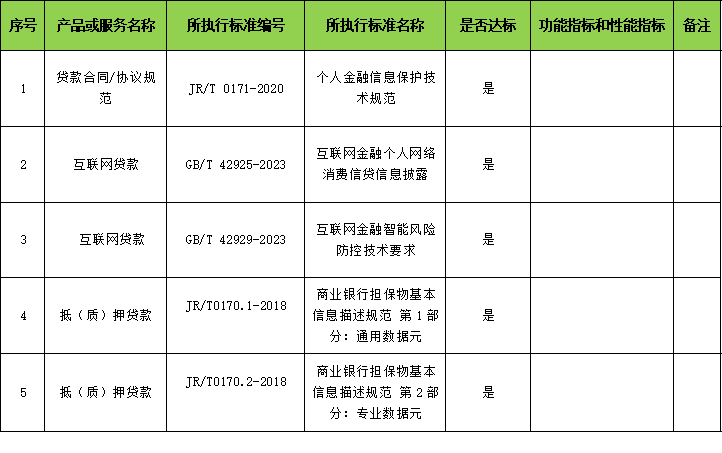 根据《中华人民共和国标准化法》有关规定,现将晋商银行股份有限公司提供的贷款产品和服务所执行的国家标准、行业标准、团体标准、企业标准情况公开如下,晋商银行承诺相关贷款产品和服务符合公开标准规定的各项技术要求,对声明公开信息的真实性、准确性、合法性负责。本次声明公开的信息统计截止2026年2月28日。如有任何疑问、意见或投诉,可前往我行任意营业网点现场咨询或投诉,或拨打客服热线95105588。